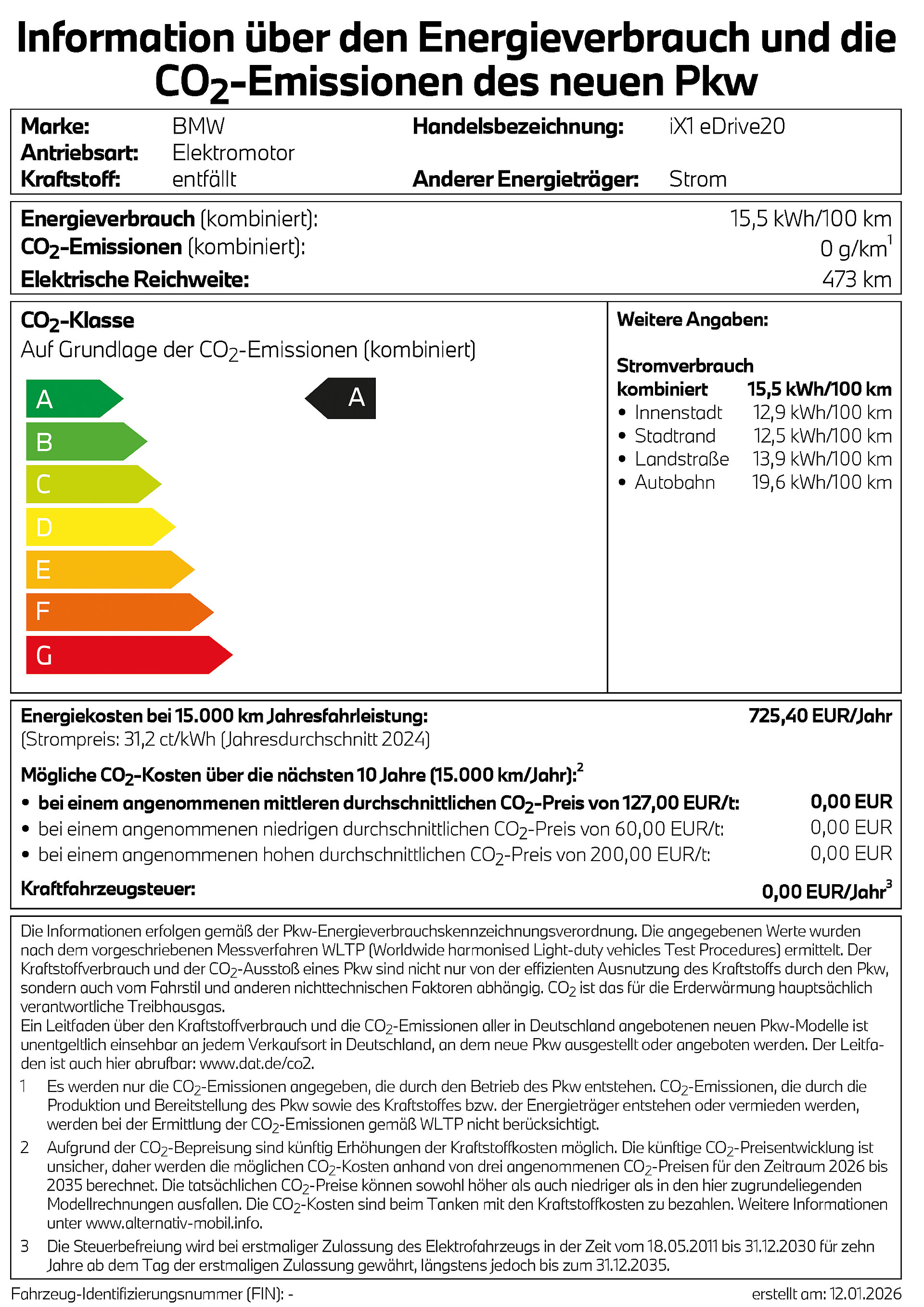 BMW iX1 eDrive20: Energieverbrauch kombiniert: 15,4 kWh/100 km (WLTP); CO2-Emissionen kombiniert: 0 g/km (WLTP); CO2-Klasse: A; Elektrische Reichweite: 474 km (WLTP); Leistung: 150 kW (204 PS)