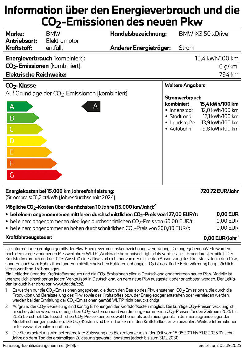 BMW iX3 50 xDrive: Energieverbrauch kombiniert: 17,9 - 15,1 kWh/100 km (WLTP); CO₂-Emissionen kombiniert: 0 g/km (WLTP); Elektrische Reichweite: 678–805 km (WLTP); CO₂-Klasse(n): A
