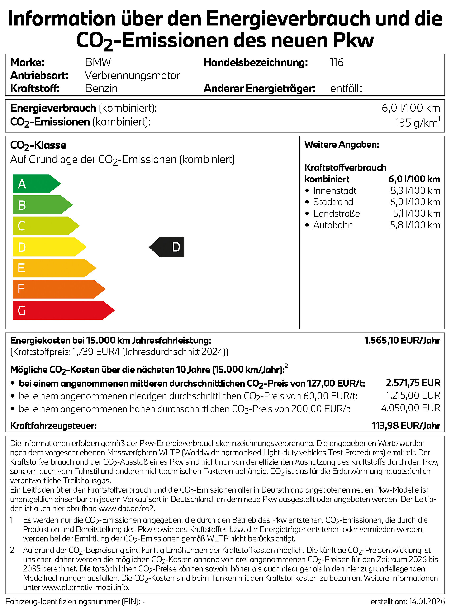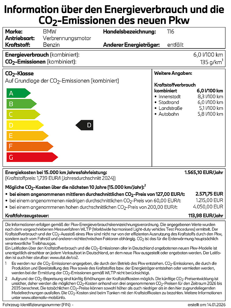 BMW 116: Energieverbrauch kombiniert: 6,0 l/100 km (WLTP); CO₂-Emissionen kombiniert: 135 g/km (WLTP); CO₂-Klasse(n): D