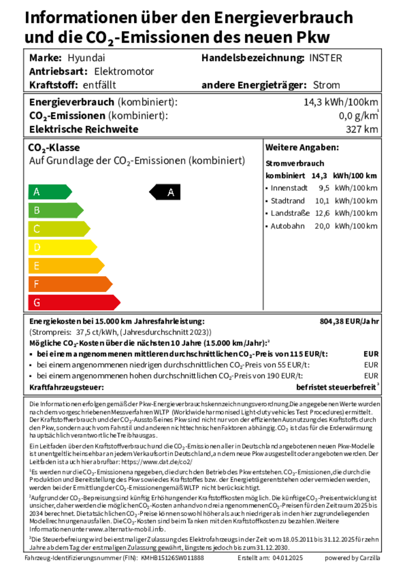 Hyundai INSTER Select 42 kW (97 PS) Batterie 42 kWh: Energieverbrauch kombiniert: 14,3 kWh/100 km; CO₂-Emissionen kombiniert: 0 g/km; CO₂-Klasse: A.