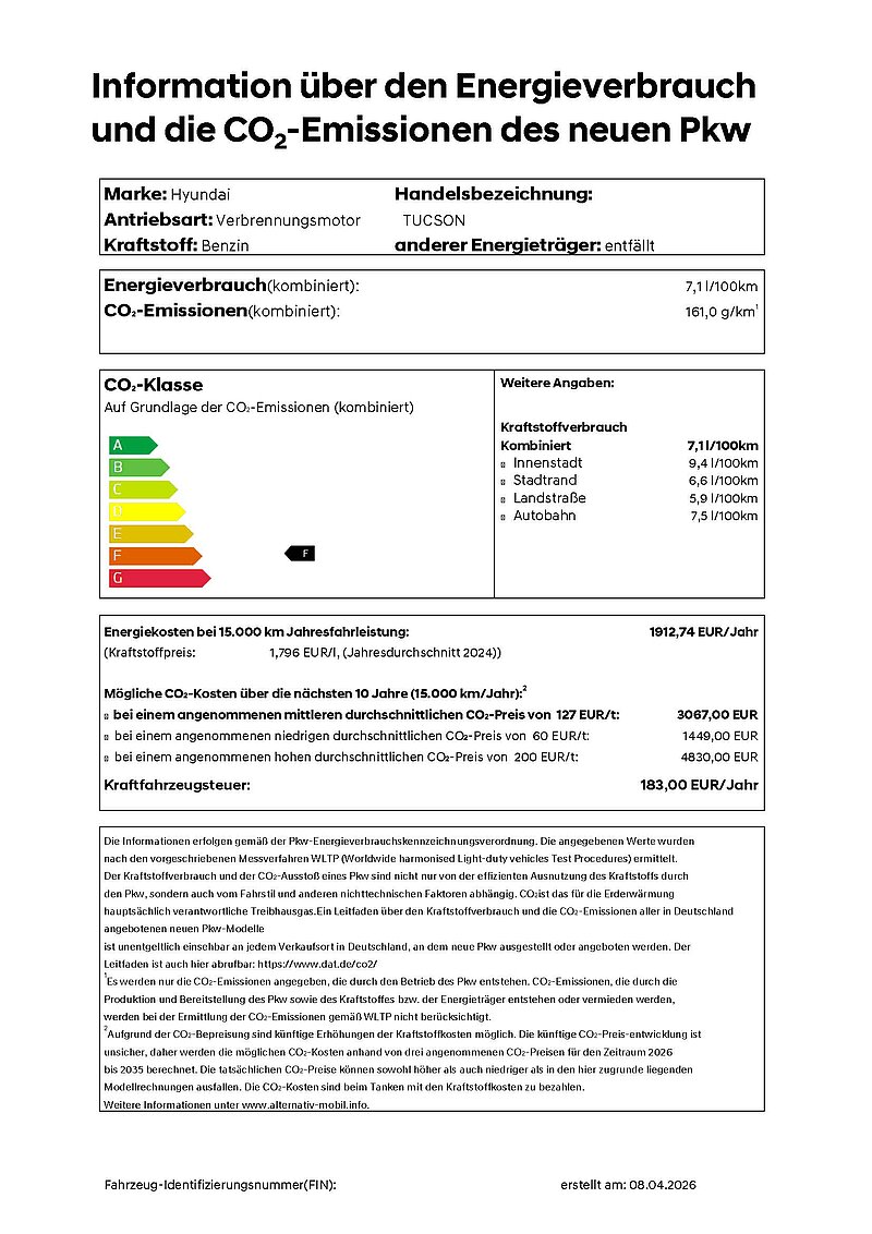 Hyundai TUCSON 1.6 T-GDI N Line, 7-Gang-Doppelkupplungsgetriebe, 110 kW (150 PS), Frontantrieb: Energieverbrauch kombiniert: 7,1 l/100km; CO₂-Emission kombiniert: 161 g/km, CO₂-Klasse: F.