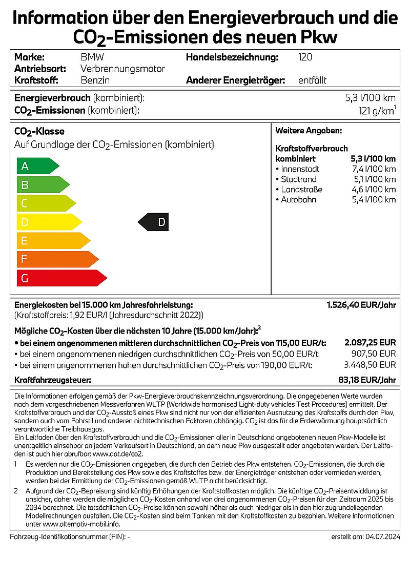 BMW 116: Energieverbrauch kombiniert: 6,0 l/100 km (WLTP); CO₂-Emissionen kombiniert: 135 g/km (WLTP); CO₂-Klasse(n): D