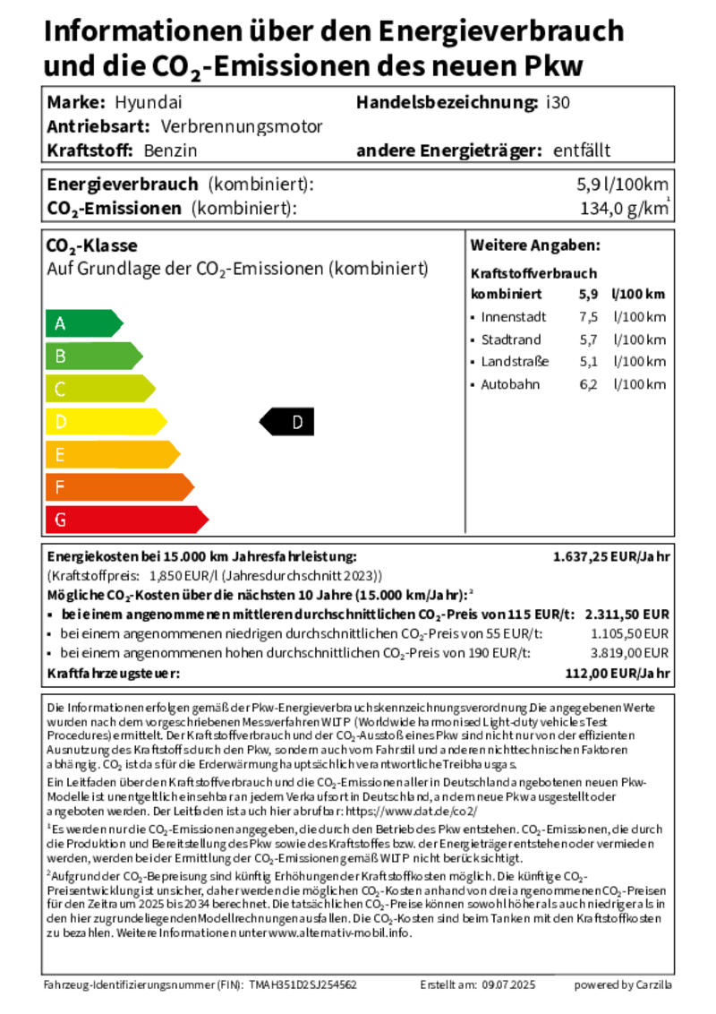 Hyundai i30 1.5 T-GDI Hybrid: Kraftstoffverbrauch kombiniert in l/100 km: 5,9 (WLTP); CO2-Emissionen kombiniert in g/km: 134 (WLTP), CO₂-Klasse: D.
