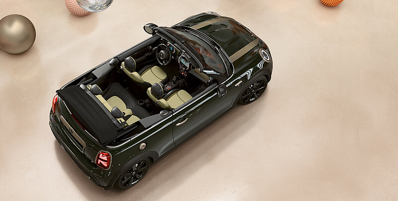 MINI COOPER S CABRIO: Kraftstoffverbrauch (kombiniert): 5,9-5,6 l/100 km (NEFZ) / 6,6-6,2 l/100 km (WLTP); CO₂-Emission (kombiniert): 135-128 g/km (NEFZ) / 151-141 g/km (WLTP).