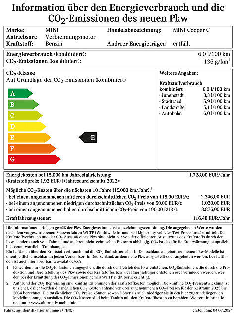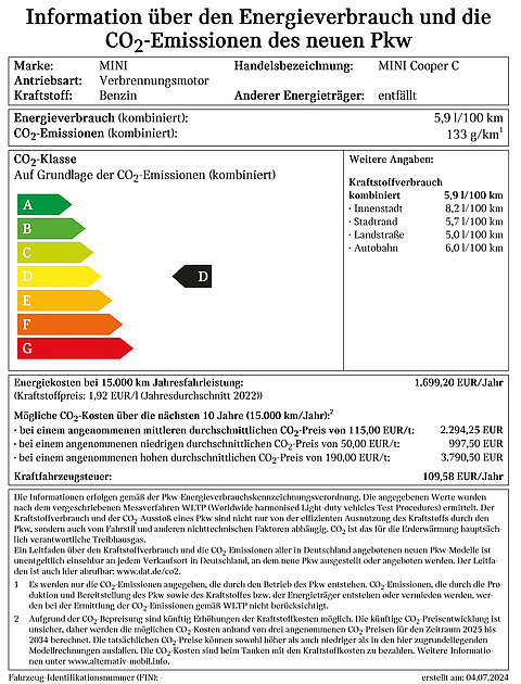 MINI Cooper 5-Türer: Kraftstoffverbrauch kombiniert in l/100 km: - (NEFZ) / 6,0 (WLTP), CO2-Emissionen kombiniert in g/km: - (NEFZ) / 136 (WLTP).