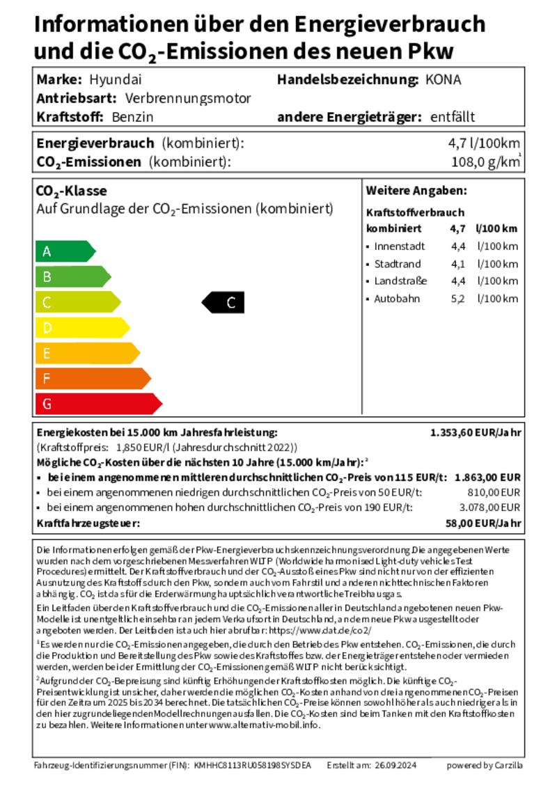 Hyundai KONA 1.0-GDi Hybrid Trend: Kraftstoffverbrauch kombiniert in l/100 km: 4,5-4,8 (WLTP); CO2-Emissionen (kombiniert) 103-108 g/km.